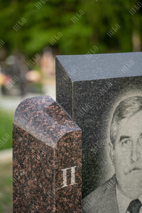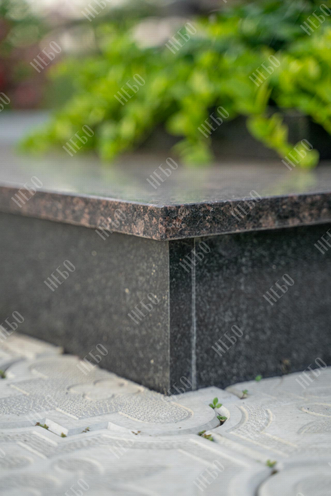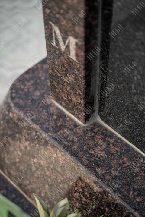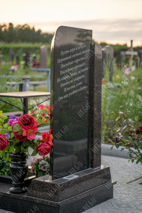 Памятник без креста с вертикальной стелой и открытым надгробием выполнен в классических темных оттенках. Стела имеет дополнительный декоративный элемент в виде вертикального столба контрастного оттенка с гравировкой. Контур памятника имеет скошенные углы, что придает ритуальному изделию индивидуальность. Открытое надгробие позволяет использовать его поверхность для высадки цветов или других растений. При изготовлении памятника специалисты тщательно прорабатывают соотношение форм, размеров и нагрузку, чтобы исключить деформации и искажения изделия со временем.