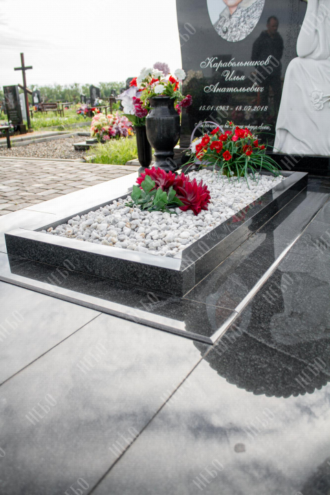 Памятник фрезерный с фигурой ангела и открытым надгробием. Использование фрезеровки в изготовлении ритуальных изделий гарантирует высочайшую точность исполнения запланированного дизайна. С помощью этой технологии в камне высекаются углубления по заданным макетам, придавая памятнику объем, позволяя комбинировать различные элементы и создавать сложные фигуры. На фрезерованном памятнике удачно контрастируют цвета и в солнечную погоду играют тени от объемных деталей. Размеры стелы и надгробия соответствуют заданным нормам при имеющейся нагрузке и исключают деформации изделия со временем.