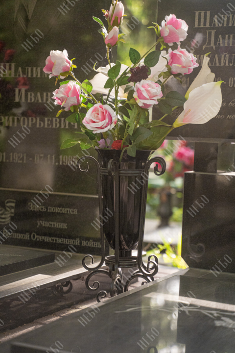 Горизонтальный памятник с кованой вазой и закрытым надгробием. Невысокая надгробная стела прямоугольной формы содержит фотографию усопшего и информацию о нем. Она отлично сочетается с закрытым гранитным надгробием. Такое решение является практичным и значительно упрощает уход за ритуальным изделием. Размеры памятника тщательно проработаны специалистами, что гарантирует конструкции долговечность и надежность.