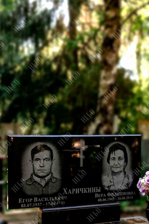 Горизонтальный семейный памятник с вазой , лампадой и закрытым надгробием. Невысокая надгробная стела прямоугольной формы содержит фото, информацию об усопших и изображение креста. Она отлично сочетается с закрытым гранитным надгробием. Такое решение является практичным и значительно упрощает уход за ритуальным изделием. Размеры памятника тщательно проработаны специалистами, что гарантирует конструкции долговечность и надежность.